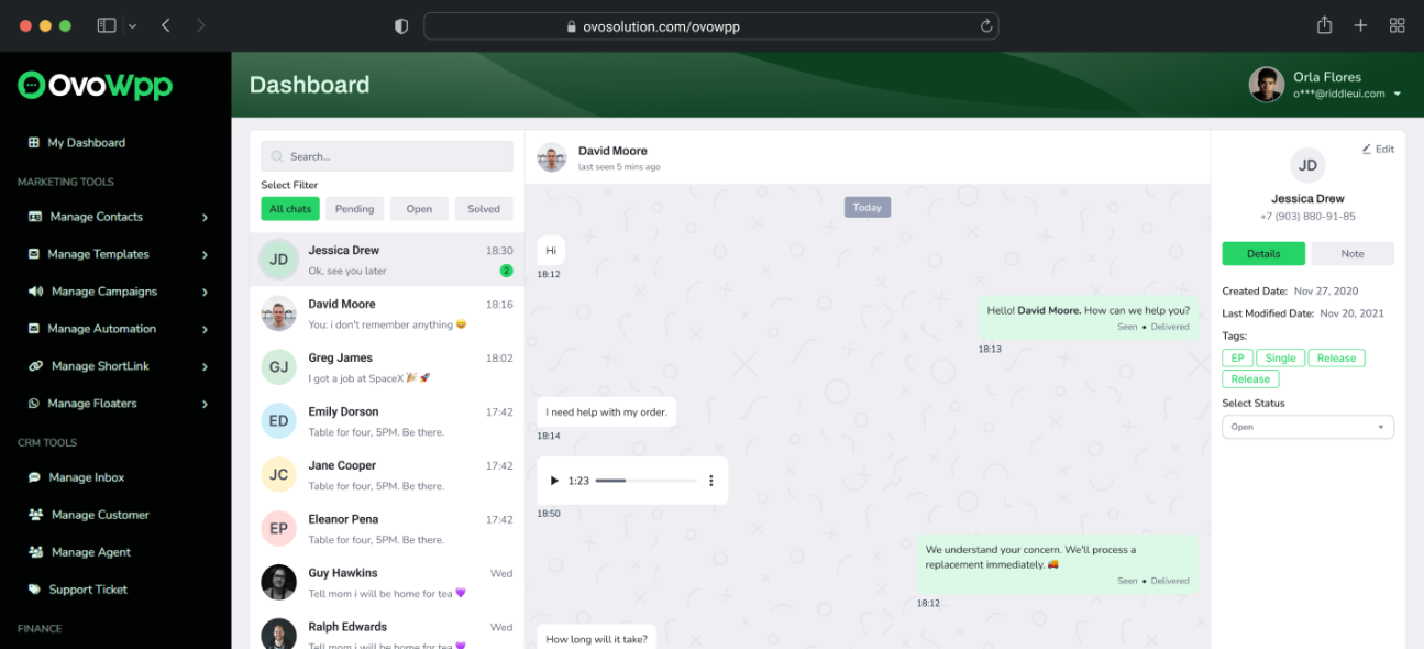 OvoWpp offers WhatsApp CRM tools, message automation, contact segmentation, multi-agent inbox, campaign analytics, and lead tracking.
